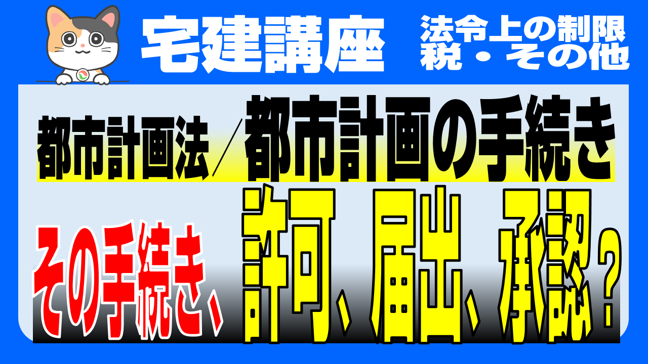 ■■法令上の制限■■宅建試験での都市計画法の、都市計画の手続きについて解説します。ここでは開発行為を行うに当たっての市町村長への手続きについて解説します。必要とされているのが許可なのか、届出なのか、承認なのかがあやふやだと、そこを問われたときに誤答の原因になります。それらの意味の違いをしっかり把握して、確実に得点につなげよう。