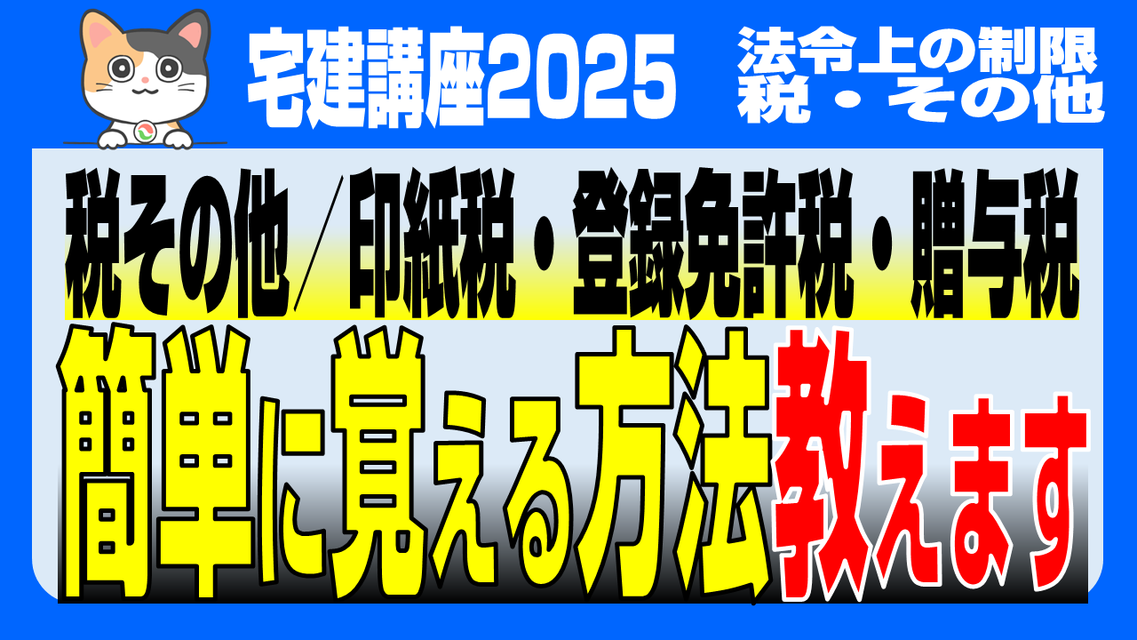 印紙税・登録免許税・贈与税で問題になるのは、税率や何に適用されるのか、されないのかが全く覚えづらいところです。この動画では、語呂合わせなどを駆使しながら覚えやすい方法をしっかりマスターできます。税金関係の問題は、勉強すれば必ず点が取れますので、これを機会に得意分野にして、今年こそ宅建試験に合格しよう!